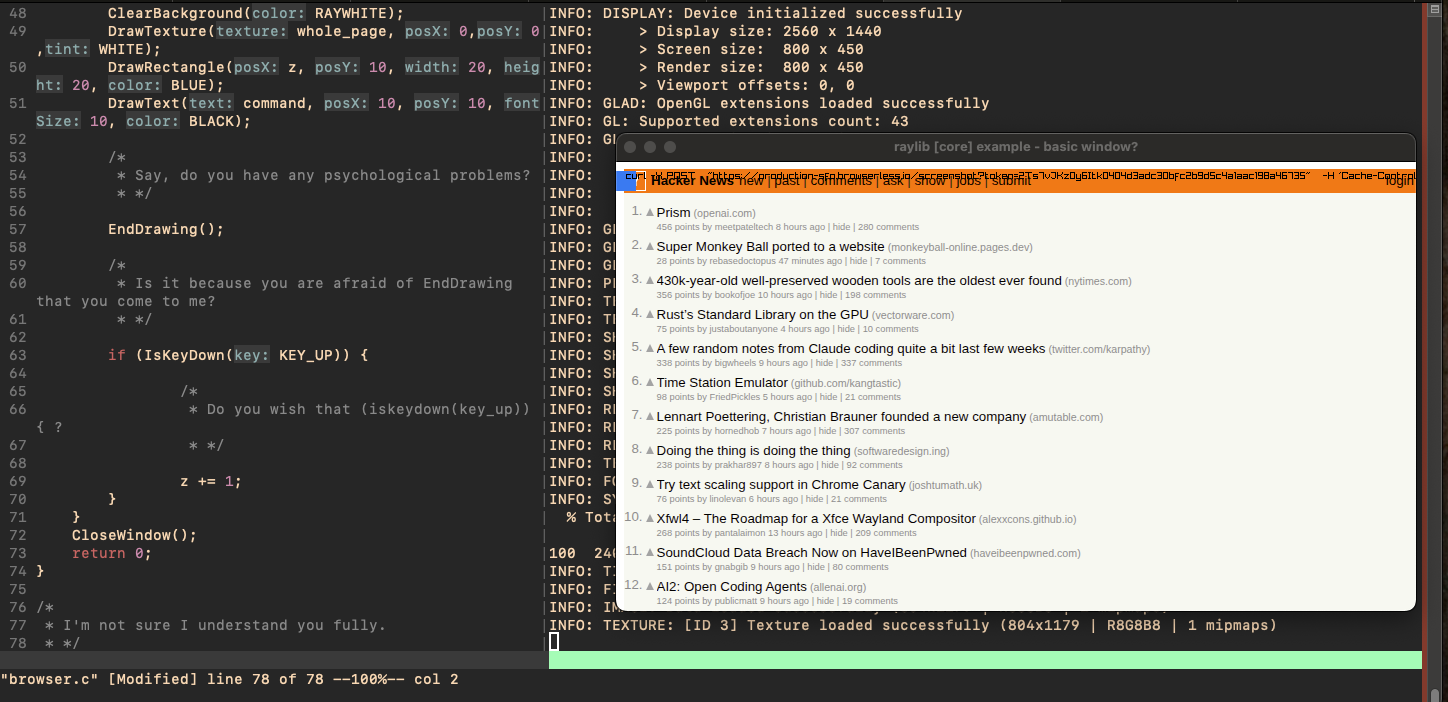I chose C as the language to implement this in, because it is hard core and low level, and decided to use raylib for rendering because my favorite youtuber likes it. These were more suggestions I made to the agent than choices I stood by: In the spirit of vibe coding, I didn't actually look much at the source code, mainly relying on the visual quality of the rendered websites and trusting my agent of choice (ELIZA) to do the heavy lifting.